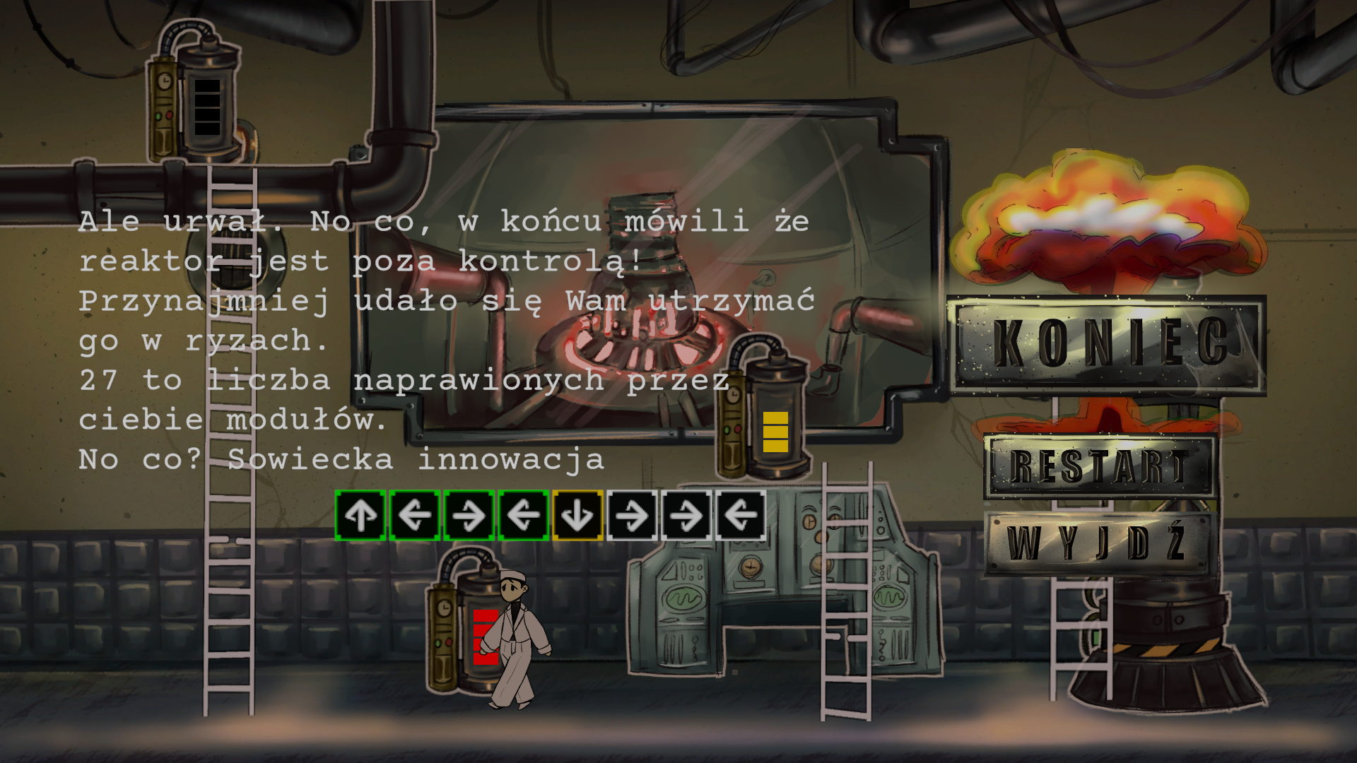 Bardzo wciągająca!! Na razie mam highscore 26 :PP Czasem na reaktorze po prawo ucina tylko strzałki. Urocze animacje, super muzyka i fajnie że można spadać z platform jako shortcut i restartować bez intra
